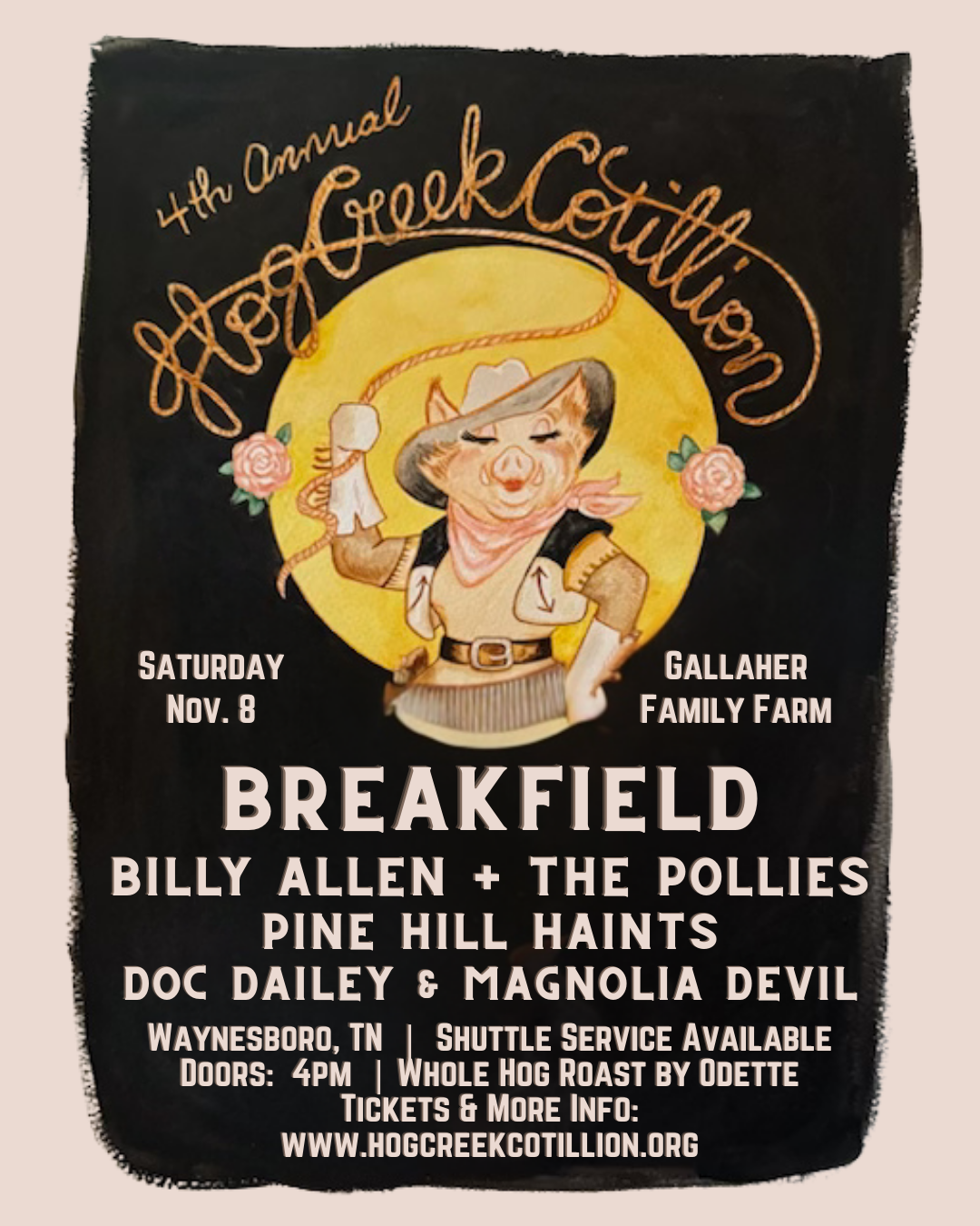 FRIDAY 11/7The Rocker Gallery Sheffield, AL6 PM Doors 7 PM Joelton Mayfield 8 PM Shovels and Rope SATURDAY 11/8Hog Creek Cotillion, 1035 Hog Creek Road, Waynesboro, TN4 PM Doors 5 PM Doc Dailey & Magnolia Devil 6 PM Pine Hill Haints7 PM Billy Allen + The Pollies8 PM Breakfield